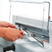 La tapa de seguridad con bisagra tiene que estar cerrada para desbloquear la palanca de corte para el proceso de corte.